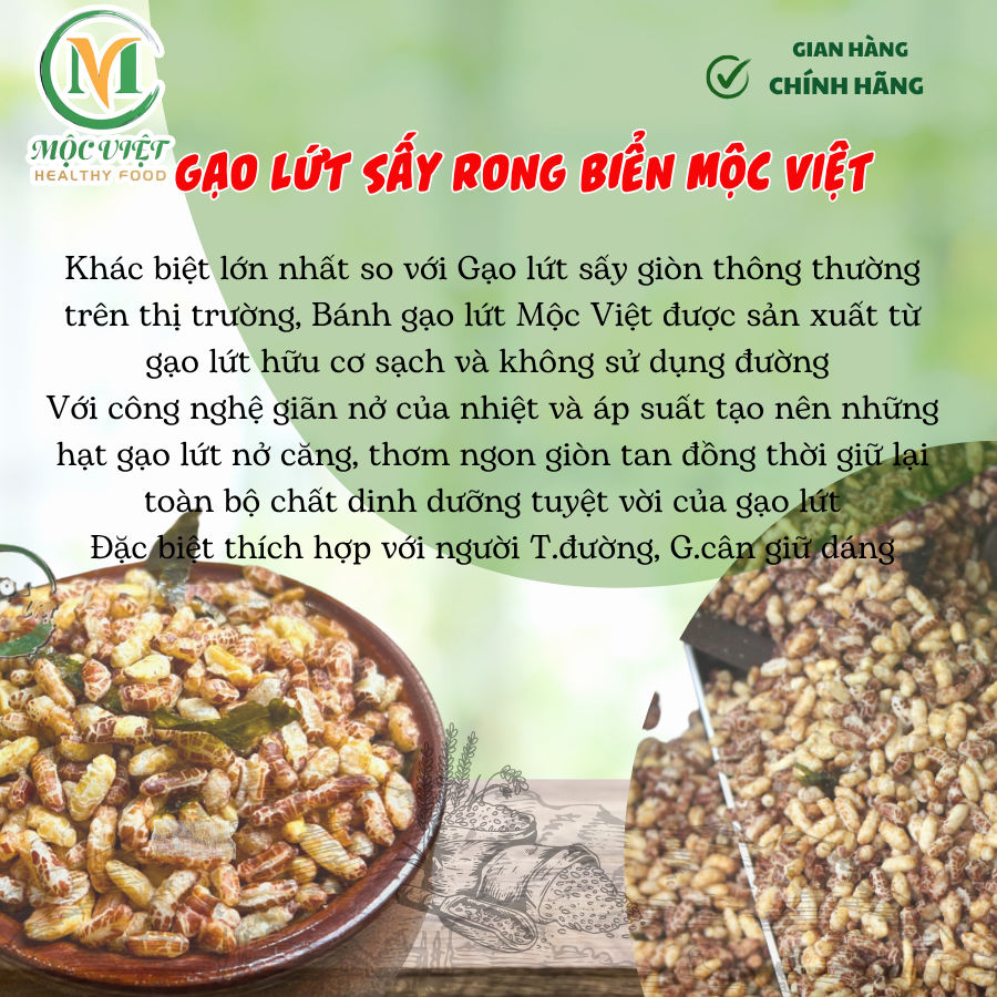 Mộc Việt Food tự hào là địa chỉ tin cậy để mua gạo lứt đỏ sấy rong biển tại Hà Nội và TP. Hồ Chí Minh. Được sản xuất từ những hạt gạo nguyên chất, được trồng trên đất sạch, không sử dụng phân bón hóa học hay thuốc trừ sâu, gạo lứt đỏ tại Mộc Việt Food không chỉ có hương vị thơm ngon, mà còn rất tốt cho sức khỏe. Khi được kết hợp với rong biển tươi ngon, thì chắc chắn sẽ tạo ra một hương vị độc đáo và hấp dẫn.